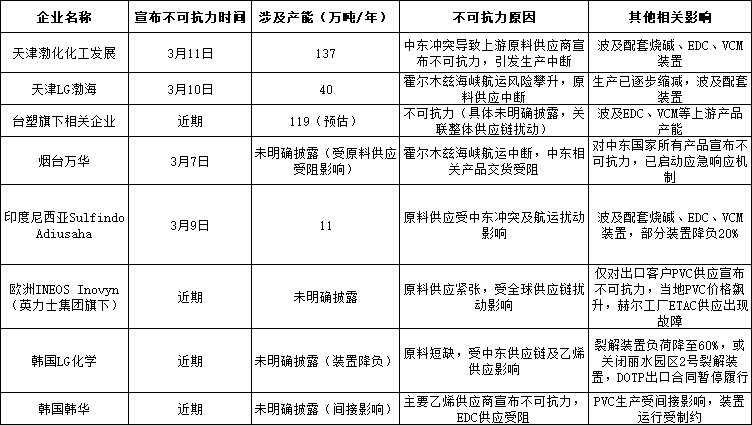 这场危机的导火索,是中东冲突点燃的供应链连锁爆炸 —— 从原料断供到航运瘫痪,从乙烯短缺到 EDC、VCM 等上游产品停摆,多米诺骨牌效应层层传导,将全球 PVC 产业拖入深渊。3 月 7 日,烟台万华率先对中东国家所有产品宣布不可抗力,启动应急响应;3 月 9 日,印尼 Sulfindo Adiusaha 因原料供应中断,11 万吨 / 年产能受冲击,配套装置降负 20%;3 月 10 日,天津 LG 渤海 40 万吨 / 年产能因霍尔木兹海峡航运风险全线缩减;3 月 11 日,天津渤化化工 137 万吨 / 年产能彻底中断,配套烧碱、EDC、VCM 装置悉数受波及;台塑旗下企业、欧洲 INEOS Inovyn、韩国 LG 化学、韩国韩华等巨头也在近期相继沦陷,台塑预估 119 万吨 / 年产能受扰,欧洲企业仅对出口客户断供便引发当地价格疯涨,韩国 LG 化学裂解装置负荷骤降至 60%,甚至面临装置关停,DOTP 出口合同全面暂停,韩华则因 EDC 供应受阻,PVC 生产近乎停摆。